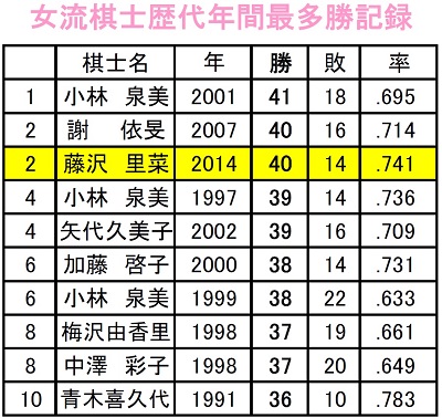 藤沢里菜女流本因坊・会津中央病院杯が25日に行われた第40期棋聖戦FT(ファーストトーナメント)で勝利をおさめ、女流棋士歴代2位タイとなる年間40勝に到達した。