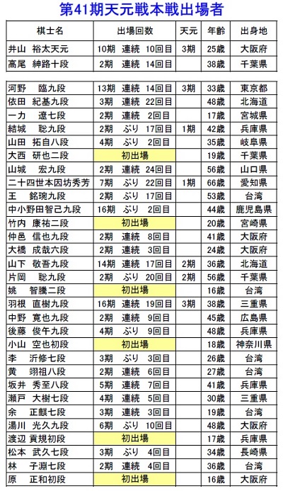 井山裕太天元に高尾紳路十段が挑戦する第40期天元戦五番勝負【主催:新聞三社連合】が進行中ですが、早くも次期の挑戦権を争う第41期天元戦本戦トーナメントが12月4日から始まります。