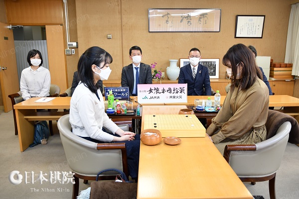 定刻の9時に立会人の泉谷英雄九段の合図で対局が始まった。 持ち時間は各4時間で本日夕刻に終局の見込み。この対局で藤沢が勝てば女流本因坊3連覇達成となる。