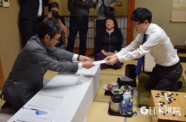井山名人が封じ手を立会の片岡聡九段に手渡す