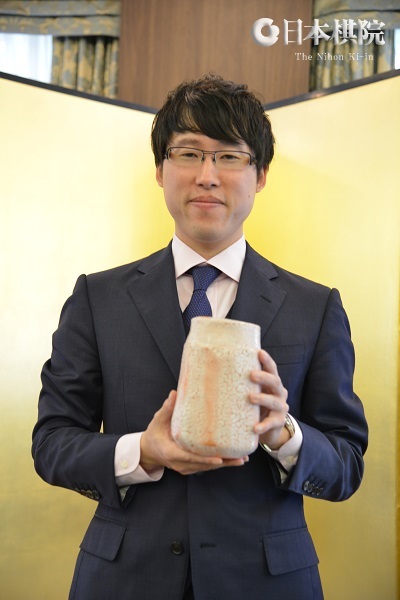 井山、記念品の「志野花入」(しのはないれ)を持ち記念撮影。
