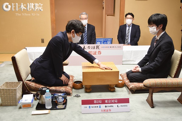 当初は福岡県北九州市「小倉城庭園書院」で行われる予定であった第2局は、同地の新型コロナ感染拡大の影響により日本棋院での対局に変更された。日本棋院東京本院で2日制の挑戦手合が行われるのは1975年7月21・22日に行われた第30期本因坊戦挑戦手合七番勝負第7局本因坊秀芳-坂田栄男九段戦以来45年ぶり。なお本日の立ち会いはその時の対局者二十四世本因坊秀芳が務める。