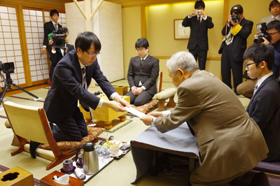 井山が封じ手を立会の工藤紀夫九段に手渡す