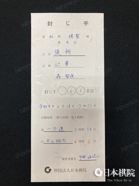 囲碁界最高位の棋戦「棋聖」の前人未到10連覇を目指す井山裕太棋聖に一力遼九段が挑戦する 第46期棋聖戦挑戦手合七番勝負 (主催:読売新聞社・日本棋院・関西棋院) 第4局が山梨県甲府市「常磐ホテル」で打たれ、17時53分に一力が61手目を封じて1日目を終えた。
