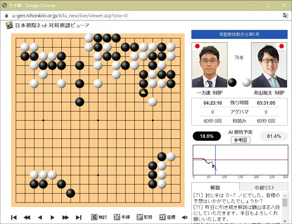 囲碁界最高位の棋戦「棋聖」の前人未到10連覇を目指す井山裕太棋聖に一力遼九段が挑戦する 第46期棋聖戦挑戦手合七番勝負 (主催:読売新聞社・日本棋院・関西棋院) 第6局が神奈川県箱根町「ホテル花月園」で再開した。9時から対局者によって昨日の手順が再現された後、封じ手が開封された。一力の封じた71手目は「15-七」ノビ。本対局は本日夕刻に終局する見込み。