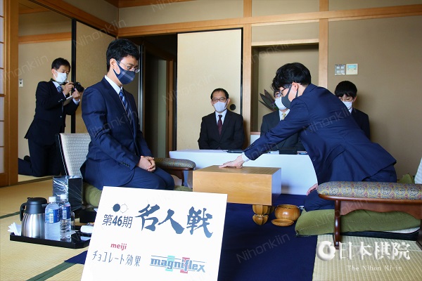 名人2連覇および通算8期を目指す井山裕太名人に一力遼天元が挑戦する 第46期名人戦挑戦手合七番勝負 (主催:朝日新聞社・日本棋院・関西棋院) 第7局が11月4日(木)に立会人の片岡聡九段の合図で定刻9時に開始。最終局の為、あらためてニギリが行われ、井山の黒番(先番)で対局開始した。本シリーズは第3局以降、黒番の勝ちが続いている。対局場は伊豆半島、今井浜海岸を臨む静岡県河津町「今井荘」。