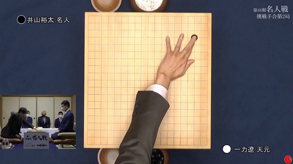 定刻の9時00分に立会人の高尾紳路九段の合図により井山の先番で対局が開始した。持ち時間は各8時間。