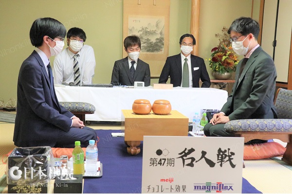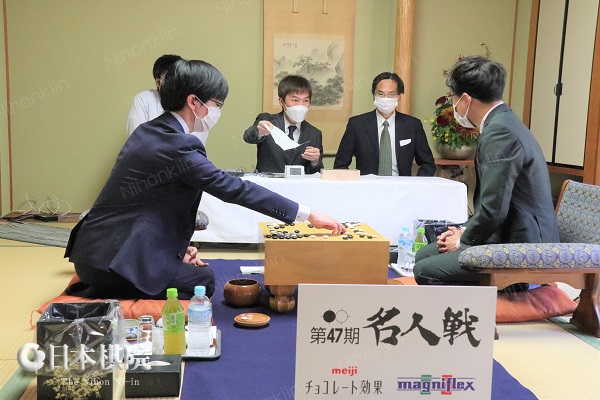 3連覇を目指す井山裕太名人に芝野虎丸九段が挑戦する 第47期名人戦挑戦手合七番勝負 (主催:朝日新聞社・日本棋院・関西棋院、協賛:株式会社明治、マニフレックス) 第3局が9月15日(木)大阪府守口市「ホテルアゴーラ大阪守口」で開始し、83手目を芝野九段が封じ1日目を終えた。2日目の9月16日(金)は9時に対局者によって昨日の手順が再現された後、封じ手が開封された。芝野の封じた83手目は13-七のツケ。本日夜半に決着の見込み。