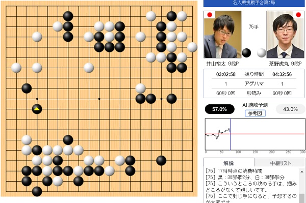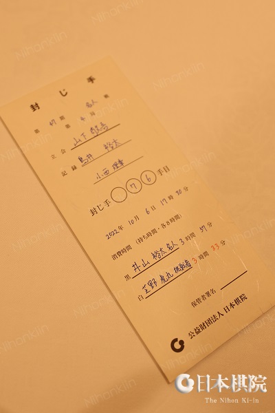 3連覇を目指す井山裕太名人に芝野虎丸九段が挑戦する 第47期名人戦挑戦手合七番勝負(主催:朝日新聞社・日本棋院・関西棋院、協賛:株式会社明治、マニフレックス)の第4局が10月6日(木)に兵庫県宝塚市「宝塚ホテル」で打たれ、芝野が76手目を封じて1日目を終えた。