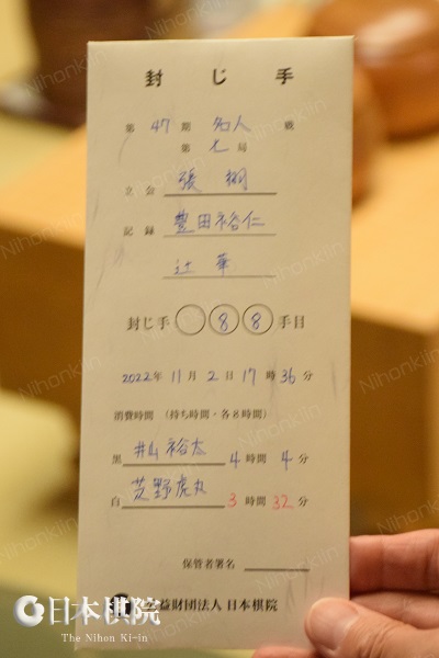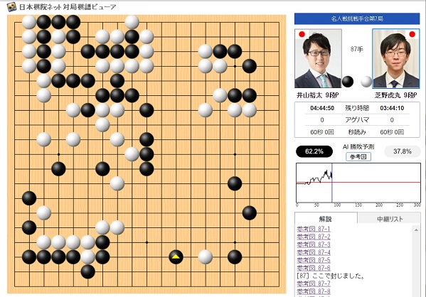3連覇を目指す井山裕太名人に芝野虎丸九段が挑戦する 第47期名人戦挑戦手合七番勝負(主催:朝日新聞社・日本棋院・関西棋院、協賛:株式会社明治、マニフレックス)の第7局が山梨県甲府市「常磐ホテル」で打たれ、芝野が88手目を封じて1日目を終えた。