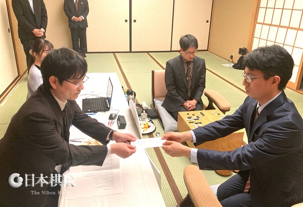 一力が封じ手の入った封筒を山下九段へ渡す
