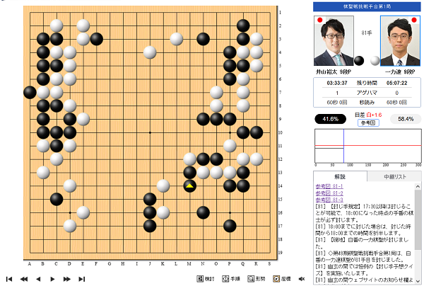 が1月11日(木)に東京都文京区「ホテル椿山荘東京」で開始、82手目を一力棋聖が封じ1日目を終えた。封じ手時刻は17時40分。