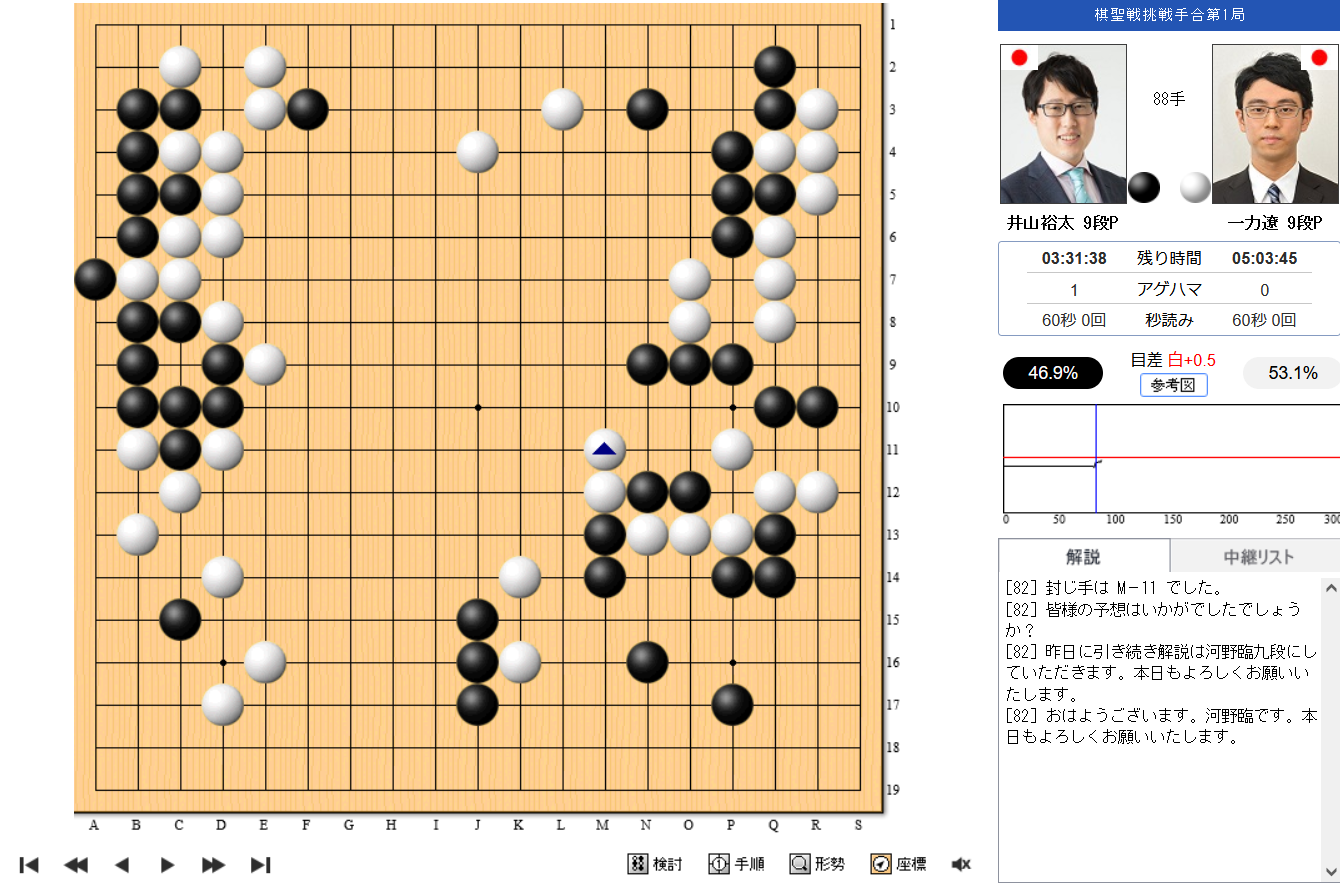 第1局は河野臨九段の解説でお届け。下記URLではAIによる評価値を確認可能。幽玄の間有料会員様は棋譜の閲覧も可能である。
