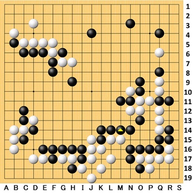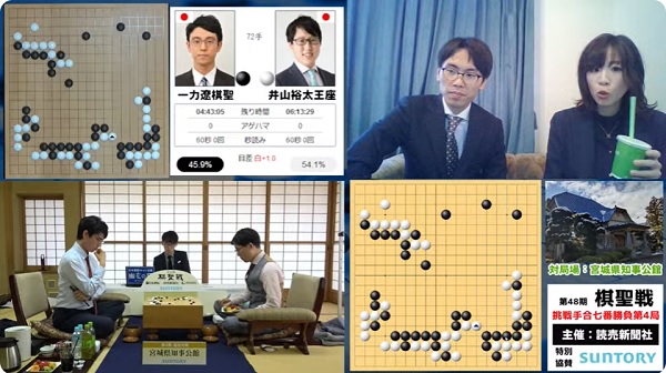 持ち時間各8時間のうち消費時間は黒の一力棋聖が4時間30分、白の井山王座が3時間30分。