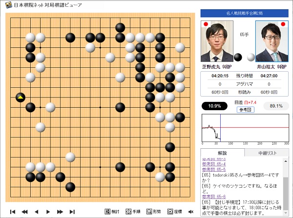 名人戦2連覇を目指す芝野虎丸名人に井山裕太王座が挑戦する 第48期名人戦挑戦手合七番勝負第2局 (主催:朝日新聞社・日本棋院・関西棋院、協賛:株式会社明治、協力:日本棋院鹿児島県連) 第2局が9月2日(土)霧島神宮で打たれ、井山が66手目を封じて1日目を終えた。本局は明日の朝9時に再開予定。