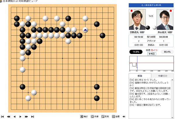 名人戦2連覇を目指す芝野虎丸名人に井山裕太王座が挑戦する 第48期名人戦挑戦手合七番勝負第4局 (主催:朝日新聞社・日本棋院・関西棋院、協賛:株式会社明治) 第4局の2日目が10月13日(金)始まった。定刻9時に両者によって昨日の並べ直しが行われ、封じ手開封へ。井山王座の封じた54手目は14‐五。本日夕刻に終局の見込み。
