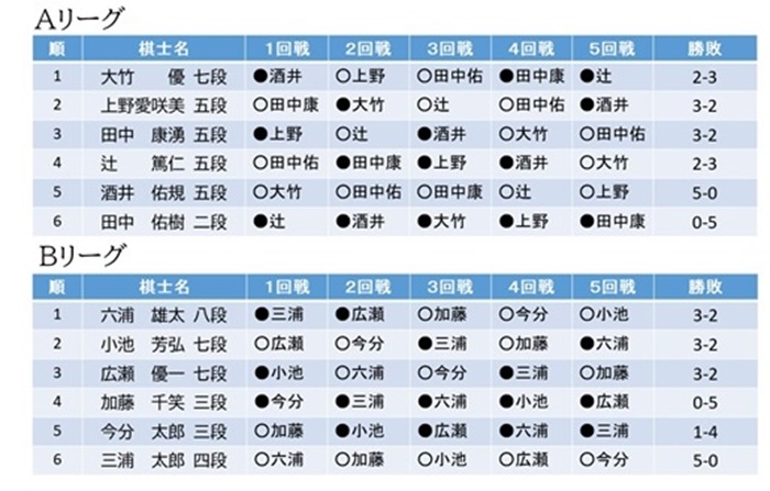 Aリーグは酒井佑規五段が5勝0敗、Bリーグは三浦太郎四段が5勝0敗で1位となった。本棋戦は各リーグの1位同士で2025年春に決勝三番勝負が行われる。