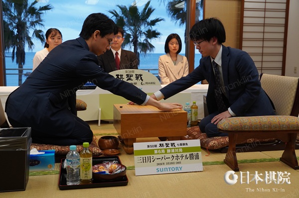 囲碁界最高位の棋戦「棋聖」5連覇を目指す一力遼棋聖に、初の棋聖獲得を狙う芝野虎丸十段が挑戦する第50期棋聖戦挑戦手合七番勝負(主催:読売新聞社・日本棋院・関西棋院、特別協賛:サントリーホールディングス) 第6局が三日月シーパークホテル勝浦で3月19日(木) 午前9時に開始した。