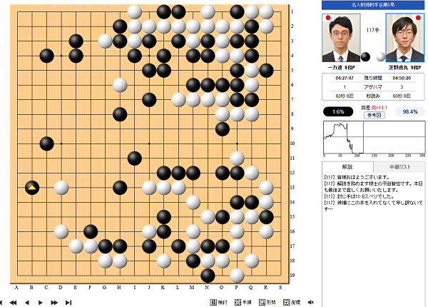 が9月12日(金)に対局再開した。定刻の午前9時に昨日の手順が対局者によって再現された後、立会人の山田規三生九段が封じ手を読み上げた。一力名人が封じた117手目は2-十三。本日夕刻に終局の予定。
