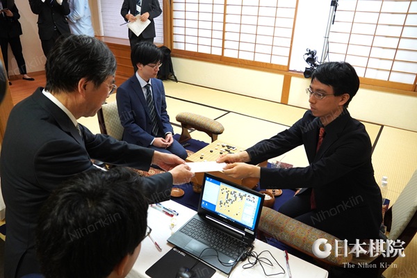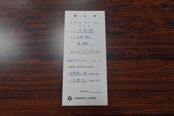 9月22日(月)に打たれ、一力名人が106手目を封じて1日目が終了した。明日の午前9時に同所で対局再開となる。