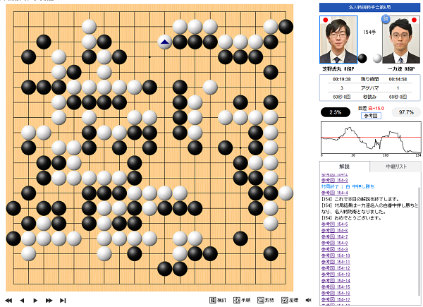 終局時刻は17時59分、消費時間は一力7時間45分、芝野7時間40分。