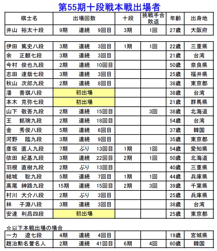 Tweet 2016年10月05日 棋戦情報 井山裕太十段への挑戦権を争う第55期十段戦【主催:産経新聞社】は6日(木)より本戦トーナメントが開幕する。トーナメント表はこちら。開幕戦は王銘琬九段―彦坂直人九段。本戦初出場は潘善琪八段、本木克弥七段、安達利昌四段の3名。この対局は日本棋院ネット対局「幽玄の間」でライブ中継いたします。本戦の模様は産経新聞観戦記でご覧いただけます。 王銘琬九段 VS 彦坂直人九段 12勝 対戦成績 6勝 17勝10敗 今期成績 16勝10敗 本因坊2期、王座1期 主な実績 第36期十段 Tweet 棋戦カテゴリのトップページはこちら 一覧に戻る 前の記事第72期本因坊戦リーグ開幕!10/6(木) 次の記事井山がシリーズ初勝利!【第41期名人戦挑戦手合七番勝負第4局】