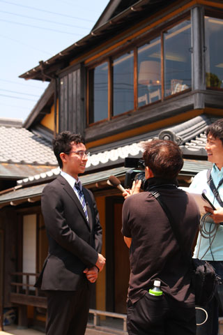 おかげ横丁「杉風荘」でテレビ局のインタビューを受ける 一力 遼 おかげ杯