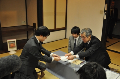 井山棋聖が立会人の二十四世本因坊秀芳に封じ手を渡して一日目が終了した