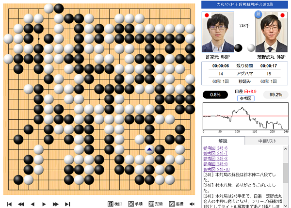 挑戦手合五番勝負第3局が4月6日(木)に長野県大町市「ANAホリデイ・インリゾート信濃大町くろよん」で打たれ、芝野が246手までで白番中押し勝ちをおさめシリーズ2勝1敗とし、十段奪取へあと1勝とした。