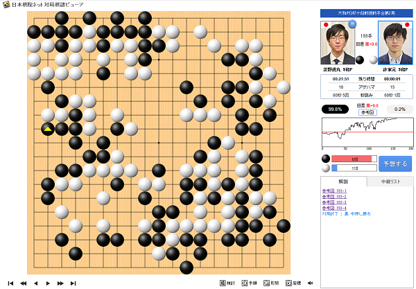 に打たれ、芝野虎丸十段が黒番中押し勝ちをおさめシリーズ1勝1敗とした。