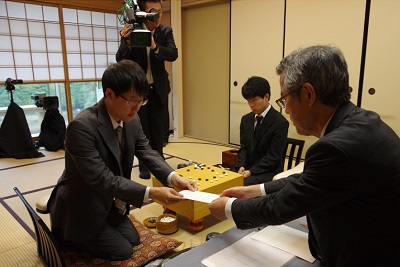 井山本因坊が立会人の二十四世本因坊秀芳に封じ手を渡して1日目が終了した