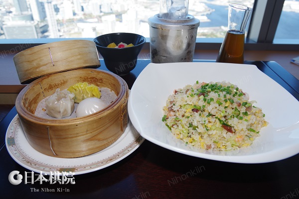 芝野昼食:五目炒飯、点心、杏仁豆腐、烏龍茶