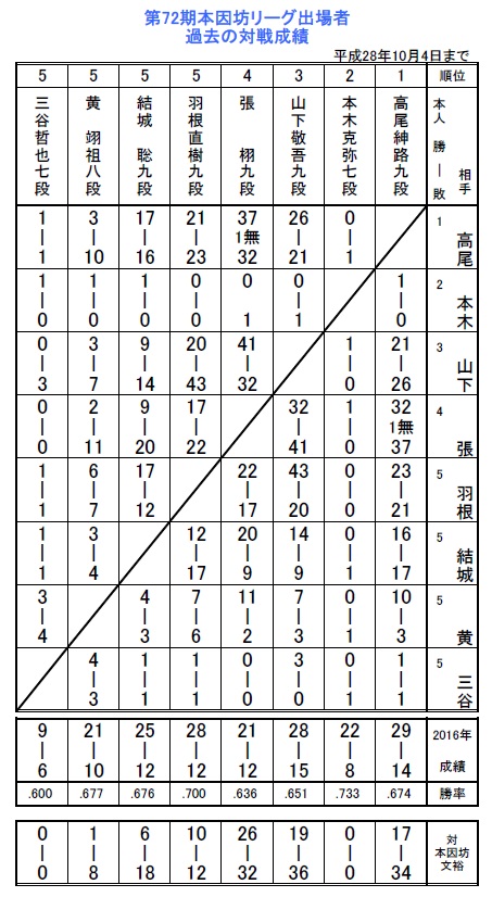 Tweet 2016年10月05日 棋戦情報 本因坊文裕への挑戦権を争う第72期本因坊戦リーグ【主催:毎日新聞社】が6日(木)に開幕する。前期挑戦者の高尾紳路九段、残留の本木克弥七段、山下敬吾九段、張栩九段に予選を勝ち上がった羽根直樹九段、結城聡九段、黄翊祖八段、三谷哲也七段の8名で4月まで総当りのリーグ戦で行われる。対戦順抽選の結果、6日の開幕戦は山下敬吾九段―張栩九段、結城聡九段―本木克弥七段の2局となった。リーグ戦の模様は毎日新聞観戦記でご覧いただけます。 Tweet 棋戦カテゴリのトップページはこちら 一覧に戻る 前の記事第41期名人戦挑戦手合七番勝負第4局 画像ギャラリー 次の記事第55期十段戦本戦開幕戦は王銘琬―彦坂直人!10/6(木)