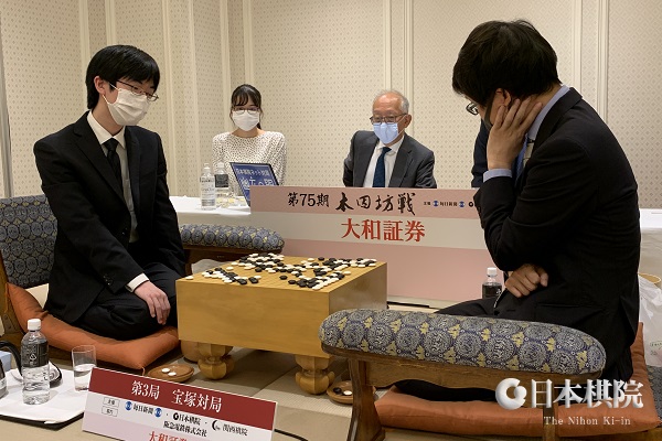 9連覇を目指す本因坊文裕(井山裕太九段)に芝野虎丸名人が挑戦する第75期本因坊戦挑戦手合七番勝負(主催:毎日新聞社)第3局が6月22,23日(月,火)に兵庫県宝塚市の「宝塚ホテル」で打たれた。