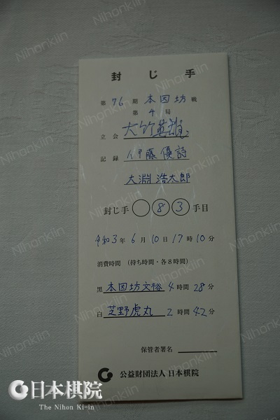 封じ手時刻は17時10分。消費時間は持ち時間各8時間のうち、 黒番の文裕が4時間28分、白番の芝野が2時間42分だった。 この対局は11日(金)9時に再開され同日夜に終局の見込み。