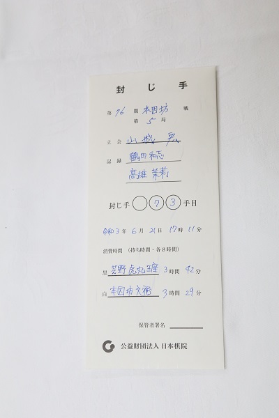封じ手時刻は17時11分。消費時間は持ち時間各8時間のうち、 黒番の芝野が3時間42分、白番の文裕が3時間29分だった。