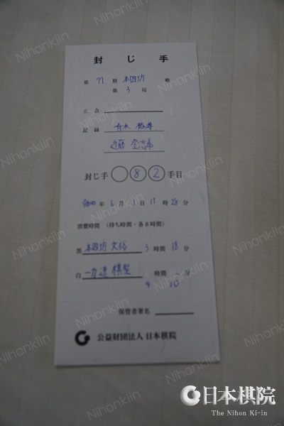 前人未到の本因坊11連覇を目指す本因坊文裕(井山裕太)に一力遼棋聖が挑戦する 第77期本因坊戦挑戦手合七番勝負 (主催:毎日新聞社・日本棋院・関西棋院)第3局が6月1日(水)に長野県高山村「藤井荘」で打たれ、一力が82手目を封じて1日目を終えた。