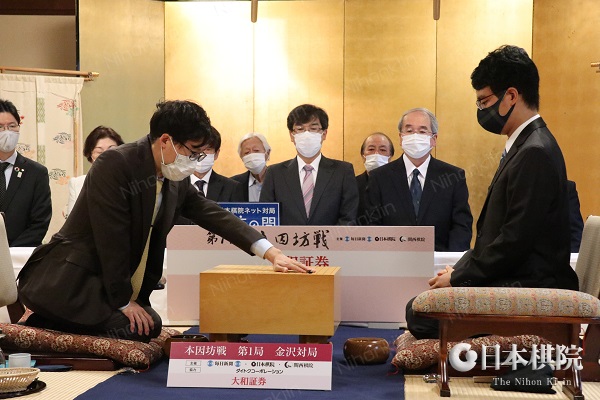 前人未到の本因坊11連覇を目指す本因坊文裕(井山裕太)に一力遼棋聖が挑戦する 第77期本因坊戦挑戦手合七番勝負 (主催:毎日新聞社・日本棋院・関西棋院)第1局が石川県金沢市「金渓閣」で開始した。定刻9時に立会の羽根直樹九段に促されてニギリが行われ、文裕の先番で対局が開始された。