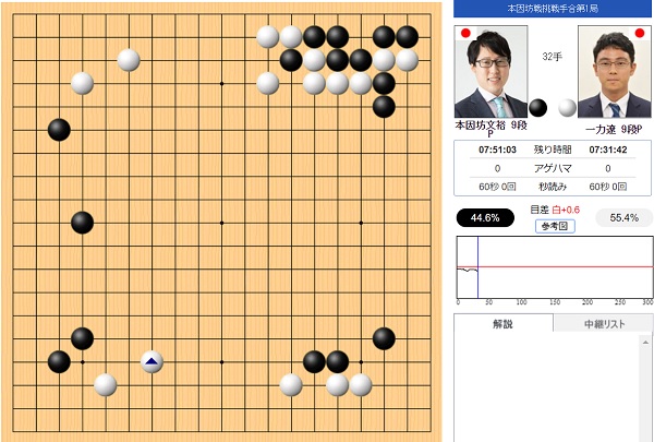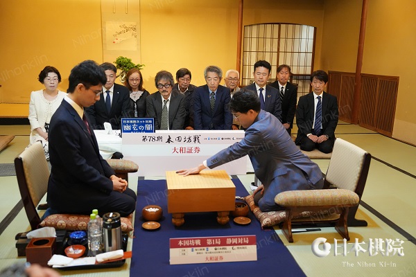 本因坊12連覇を目指す本因坊文裕(井山裕太)に一力遼棋聖が挑戦する 第78期本因坊戦挑戦手合七番勝負 (主催:毎日新聞社・日本棋院・関西棋院)第1局が静岡県静岡市「浮月楼」で開始した。定刻9時に立会の二十五世本因坊治勲(趙治勲)に促されてニギリが行われ、文裕の先番で対局が開始された。