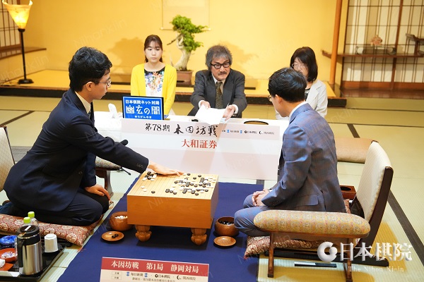 本因坊12連覇を目指す本因坊文裕(井山裕太)に一力遼棋聖が挑戦する 第78期本因坊戦挑戦手合七番勝負 (主催:毎日新聞社・日本棋院・関西棋院)第1局が静岡県静岡市「浮月楼」で2日目が開始。定刻9時に両対局者によって昨日の手順が再現された後、立会人の二十五世本因坊治勲によって封じ手が読み上げられた。一力の封じ手は18-十一ツケ。