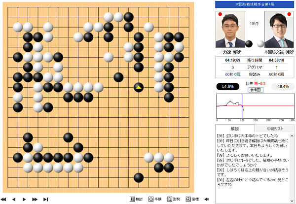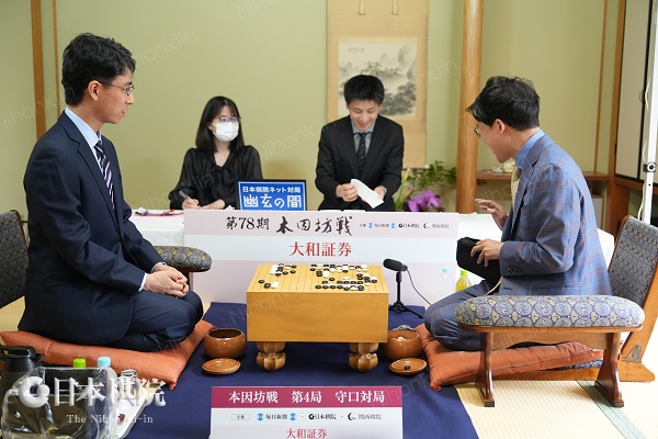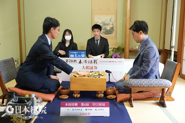 本因坊12連覇を目指す本因坊文裕(井山裕太)に一力遼棋聖が挑戦する 第78期本因坊戦挑戦手合七番勝負 (主催:毎日新聞社・日本棋院・関西棋院)第4局が大阪府守口市「ホテルアゴーラ大阪守口」で対局が行われ、一力棋聖が99手目を封じて1日目が終了。
