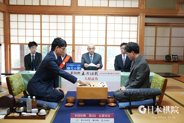 本因坊12連覇を目指す本因坊文裕(井山裕太)に一力遼棋聖が挑戦する 第78期本因坊戦挑戦手合七番勝負 (主催:毎日新聞社・日本棋院・関西棋院)第5局が京都府京都市「寂光寺」で対局再開。両対局者によって昨日の手順が再現された後、立会人の武宮正樹九段が封じ手を読み上げた。一力が封じた84手目は8-九「ハネ」。