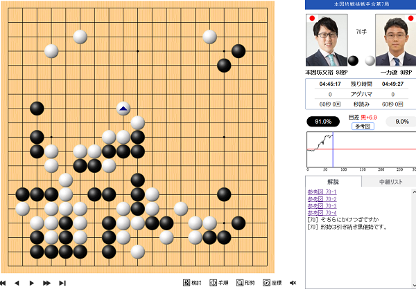 本因坊12連覇を目指す本因坊文裕(井山裕太)に一力遼棋聖が挑戦する 第78期本因坊戦挑戦手合七番勝負 (主催:毎日新聞社・日本棋院・関西棋院)第7局が三重県鳥羽市「戸田家」で打たれ、本因坊文裕が71手目を封じて1日目終了となった。