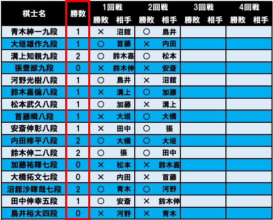 内田修平八段、鈴木伸二八段、沼舘沙輝哉七段の4人が2連勝した。2日目は10時より3回戦、14時より4回戦が行われ優勝者が決定する。