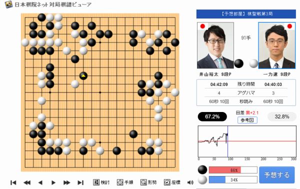 日本棋院ネット対局「幽玄の間」ではこの挑戦手合の対局を全局、棋士による解説付き棋譜ライブ中継を実施。 第3局2日目は溝上知親九段の解説でお届けする。下記URLではAIによる評価値を確認可能。幽玄の間有料会員様は棋譜の閲覧も可能である。