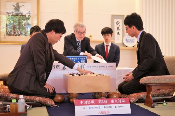 本因坊12連覇を目指す本因坊文裕(井山裕太)に一力遼棋聖が挑戦する 第78期本因坊戦挑戦手合七番勝負 (主催:毎日新聞社・日本棋院・関西棋院)第3局の2日目が東京都千代田区「神田明神」で午前9時から再開した。両対局者によって昨日の手順が再現された後、立会人の24世本因坊秀芳が読み上げた文裕の封じ手(79手目)は5-五だった。
