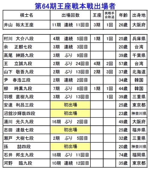 Tweet 2016年05月18日 棋戦情報 井山裕太王座への挑戦権を争う第64期王座戦【主催:日本経済新聞社】は5月19日(木)より本戦トーナメントが開幕する。組み合わせ表はこちら。19日の開幕戦は羽根直樹九段―孫喆四段の対戦となる。王座戦本戦の模様は日本経済新聞の観戦記でご覧いただけます。 本戦初出場は4名。最多出場は王立誠九段で24回目。最年少は余正麒七段と孫喆四段で20歳。最年長は石井邦生九段で74歳。井山裕太王座との師弟対決となるか?前期まで13期連続出場で王座通算7期の張栩九段は予選で敗れた。 Tweet 棋戦カテゴリのトップページはこちら 一覧に戻る 前の記事【5月第4週】「幽玄の間」中継予定 次の記事第72期本因坊戦最終予選開幕!