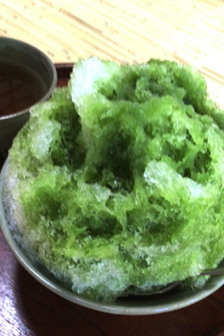 抹茶蜜のかき氷の中に白玉とこしあんが入っている