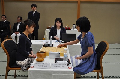 藤沢里菜二段―万波奈穂三段 白中押し勝ち