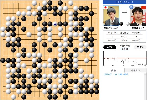 芝野虎丸九段(日照山海大象チーム)が成都懿錦控股チームの党毅飛九段と対戦し222手までで黒番中押し負けを喫した。